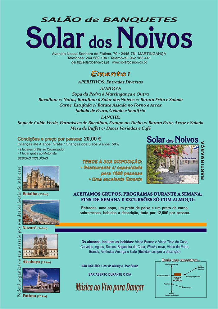 O Solar dos Noivos consagra-se num espaço de 2500m2, em harmonia perfeita entre uma arquitectura moderna de linhas simples, para a realização de qualquer evento. Situa-se na freguesia da Martingança, concelho de Alcobaça, com excelentes acessibilidades às auto-estradas A8, A15 e A1.